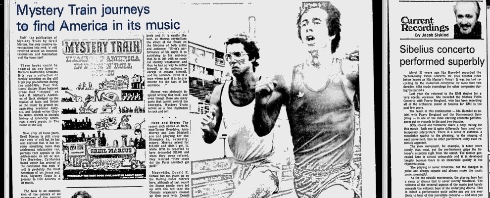 “Now, after all these years, Greil Marcus is still crazy over rock ‘n’ roll but he has also realized that it has become something more than adolescent infatuation (or, perhaps rock appeals to the adolescence in all of us). The Berkeley, California-based writer has arrived at the conclusion that rock ‘n’ roll is probably the most American of art forms and, thus, Mystery Train is a journey to find America in its music…”