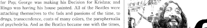 1967: February—Beatles release “Strawberry Fields Forever,” hailed as “psychedelic” because of backward music at fade. June—on eve of San Francisco’s projected mass hippie Summer of Love influx, Beatles release Sgt. Pepper’s Lonely Hearts Club Band, superpsychedelic LP that tops all toppers. Paul announces Beatle LSD use. August—Brian Epstein dies of pill overdose. Beatles, on retreat with Maharishi Mahesh Yogi, Eastern religionist, announce they will manage themselves. Gleam appears in religionist’s third eye. December—Beatle TV film, Magical Mystery Tour, bombs in Britain; first real Beatle failure.