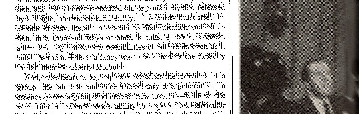 Enormous energy—the energy of frustration, desire, repression, adolescence, sex, ambition—finds an object in a pop explosion, and that energy is focused on, organized by and released by a single, holistic cultural entity. This entity must itself be capable of easy, instantaneous and varied imitation and extension, in a thousand ways at once; it must embody, suggest, affirm and legitimize new possibilities on all fronts even as it outstrips them. This is a fancy way of saying that the capacity for fad must be utterly profound.