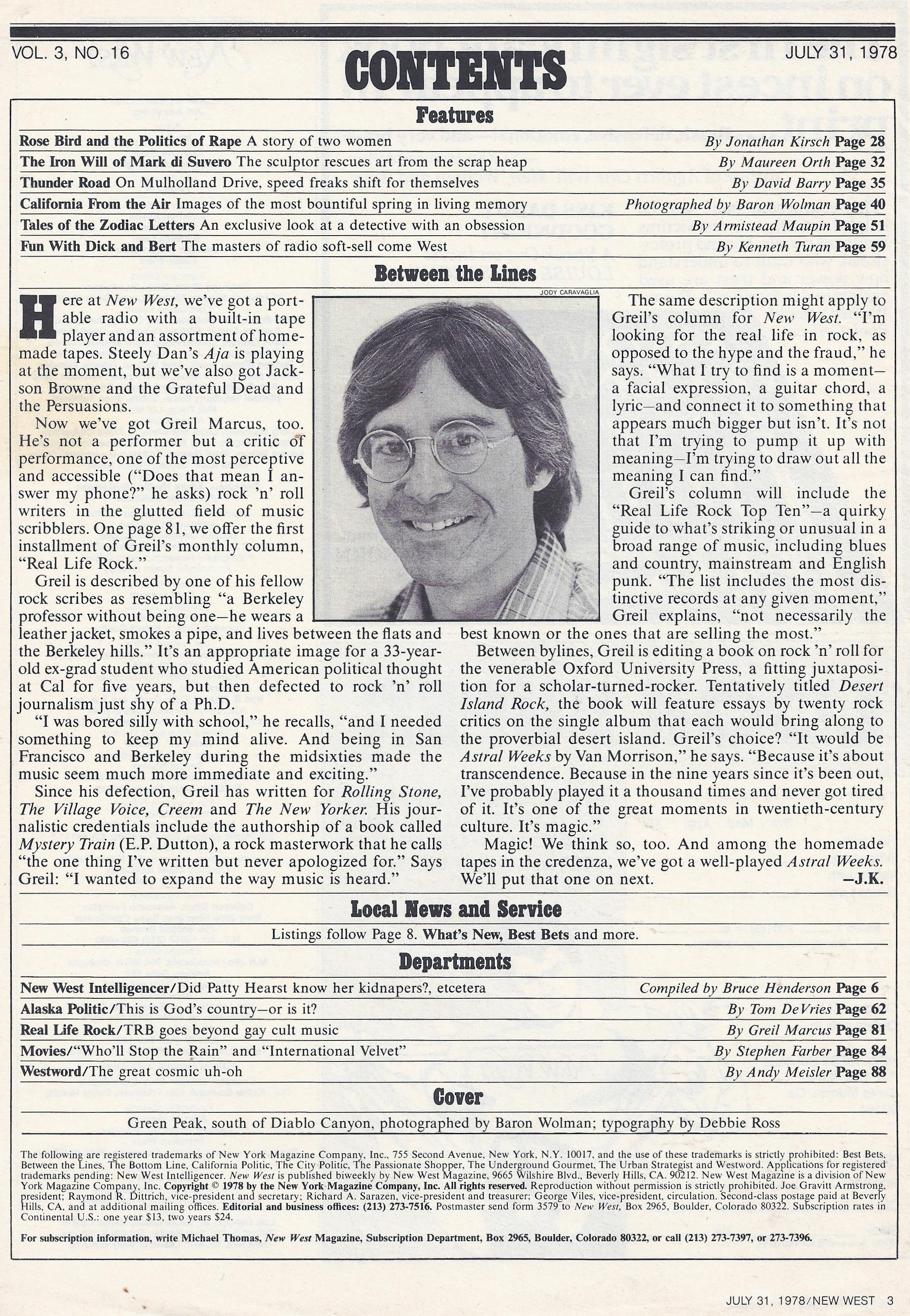 July 21, 2014 by GM Admin “Now we’ve got Greil Marcus, too…” (07/31/78) [Stay tuned for the first-ever installment of Greil Marcus’s “Real Life Rock” column from New West magazine, appearing on GreilMarcus.net soon. Special thanks to Erik Nelson. — GM Admin] New West, July 31, 1978 Share this: Click to share on X (Opens in new window) X Click to share on Facebook (Opens in new window) Facebook Click to share on Tumblr (Opens in new window) Tumblr Like Loading...