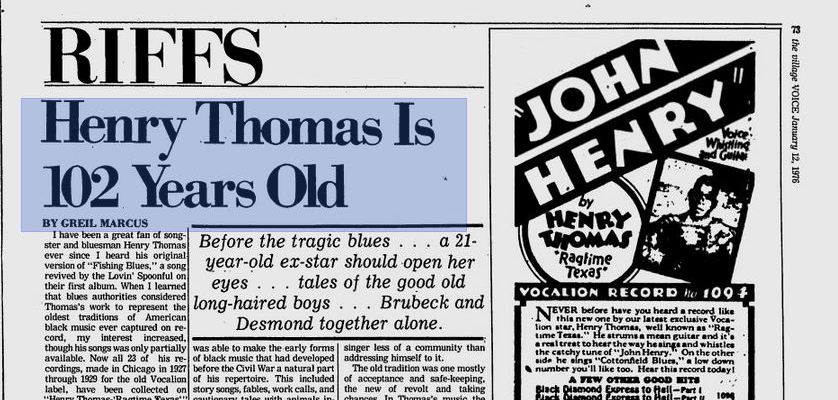 Mack McCormick’s notes to Henry Thomas’s recordings deserve special notice. McCormick’ met Thomas on the street 27 years ago, when the man was very old and could hardly play or sing, and when McCormick had no idea of who he was. His exhaustive consideration of Thomas’s life, his music, and the traditions out of which he worked are full of the passion one might expect such a chance encounter, or missed chance, to inspire. They are the best notes of their kind I have ever read: literate, wide-ranging, deeply scholarly but never pedantic, sensitive to ambiguity in both facts and interpretation–in themselves a first-rate introduction to the pre-blues and blues traditions of the country South. I hereby nominate them for the Grammy they won’t get.
