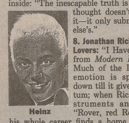 Fanzine with ’60s UK would-be teen idol Heinz on the cover (I never heard of him either) and lots of words inside: “The inescapable truth is that avoiding critical thought doesn’t dispel the need for it–it only submits you to somebody else’s.”