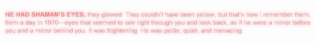 He had shaman’s eyes; they glowed. They couldn’t have been yellow, but that’s how I remember them, from a day in 1970—eyes that seemed to see right through you and look back, as if he were a mirror before you and a mirror behind you. It was frightening. He was polite, quiet, and menacing. As a guest in a friend’s house, he set himself up as king and issued commands as to how the people there should live, telling his host to leave his girlfriend, that she was not on the side of his destiny. I had no idea who this person really was. Did he? Was that the whole point, the point of all those shape-shifting, unstable, slithering songs, that there was nothing fixed?