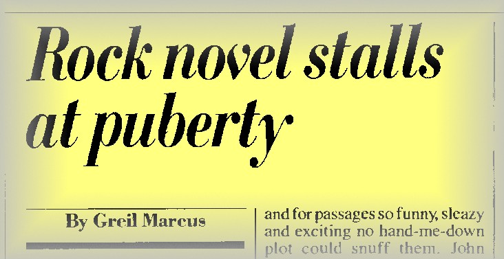 Any rock novel hung on the purity-corruption dichotomy has to turn to rise-and-fall for its resolution, because a novel conceived so sentimentally requires a sentimental moral rebalancing: the star must suffer for his glory, not by paying his dues, but after the fact. Well, rock & roll is full of good material along that line, but does such a view really tell us much about Janis Joplin, Elvis Presley, the Rolling Stones or the Sex Pistols? Does it tell us much about the people who listen? If rock really has only one story to tell, maybe it’s time for would-be rock novelists to find another subject; if it has more, it’s time for them to start thinking about what those stories might be.