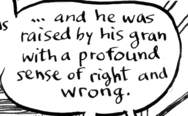 Greil Marcus depicted in Chris Esty and David Lasky’s “Last Testament,” from Fanatagraphics’ HOTWIRE anthology, Vol. II.