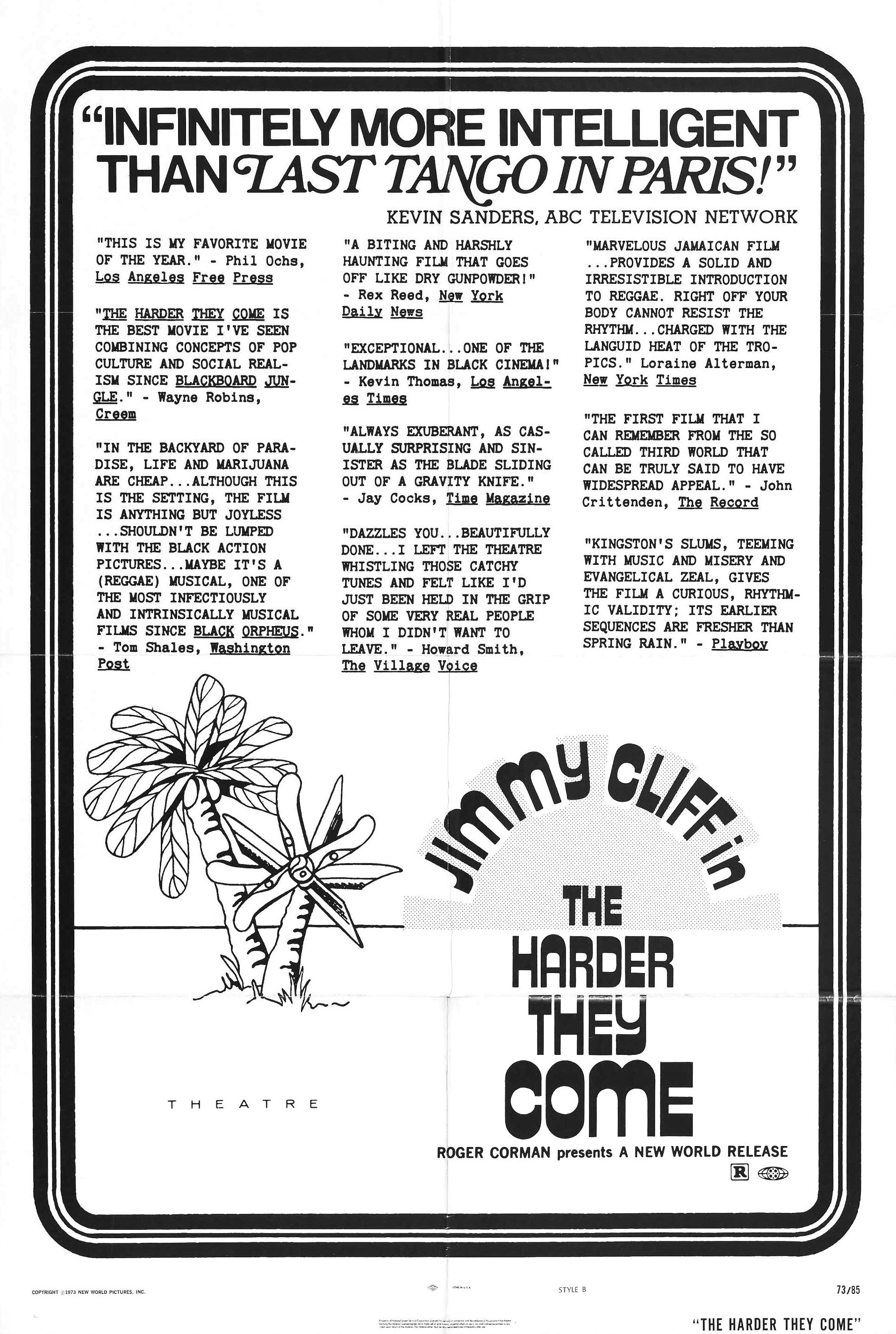 Henzell based his movie on the legend of Rhygin, a Jamaican gunman of the late forties. Moving the tale forward in time and adding a reggae subplot, he cast Jimmy Cliff as Ivan, the country boy who comes to Kingston dreaming of success as a singer and ends up on the top of the pop charts and the most wanted list at the same time. With a doomed but innocent hero, hot new music and an exotic setting, the film—probably understood by American audiences as Jailhouse Rock plus Black Orpheus plus Superfly—remains the sole Jamaican export to have entered the shared pop myth that works as the collective unconscious of contemporary popular culture. (Bob Marley has countered the prepolitical adventures of Rhygin-Ivan with a fully politicized vision of Jamaican—and, by implication, African and Afro-American—history; in this country, his best-known song remains “I Shot the Sheriff”—in which he plays the part of Rhygin-Ivan.)
