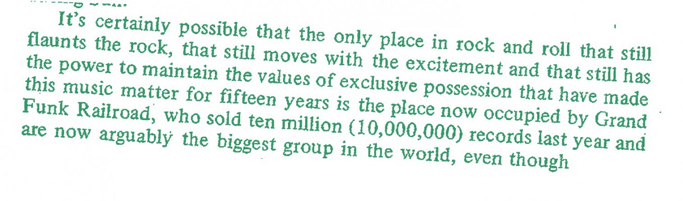 It’s certainly possible that the only place in rock and roll that still flaunts the rock, that still moves with the excitement and that still has the power to maintain the values of exclusive possession that have made this music matter for fifteen years is the place now occupied by Grand Funk Railroad, who sold ten million (10,000,000) records last year and are now arguably the biggest group in the world, even though 1) their music is not played on FM radio; 2) their music is not played on AM radio; 3) their records are panned or ignored by the rock press; 4) many people who care about rock and roll don’t listen to them; 5) some people who care about rock and roll have never heard of them. This band, and their audience, now have possession of a music that cannot for the moment be shared with the rock and roll audience as such. [6] Because it can’t be shared it is secret, and powerful. Grand Funk is not merely fragmenting the audience, like most everyone else; they may be dividing it. Not only are they big enough to do that, but they seem to be speaking directly to a new pop audience that is fast breathing down the neck of the old one and that may make the old one irrelevant. “[This group] has got something its competitors don’t have,” said Terry Knight recently. “You have to go to people like Presley, the Beatles, the Stones and Sinatra to find it. Grand Funk says something to its audience that no other rock group says today. It is saying to its audience that ‘We are part of you. We are your voice.'”