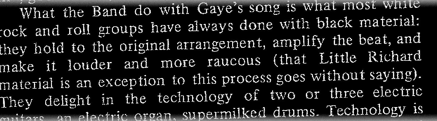 What the Band do with Gaye’s song is what most white rock and roll groups have always done with black material: they hold to the original arrangement, amplify the beat, and make it louder and more raucous (that Little Richard material is an exception to this process goes without saying). They delight in the technology of two or three electric guitars, an electric organ, super-miked drums. Technology is the white man’s cultural heritage, as well as his burden, and at least rock and roll musicians occasionally know what to do with it; they can relate to technology as black artists sometimes cannot. They don’t worry about “worrying” a line into an elusive rendering of “soul”; they just sing as hard as they can. They hit everything hard and if the Band caught this same spirit on stage they might knock over a microphone.