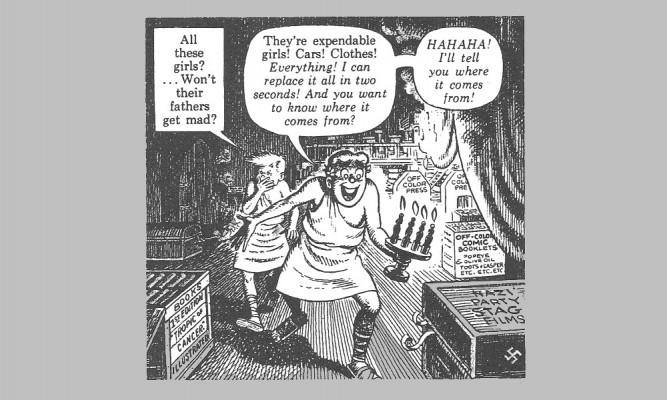 Archie drags Goodman to his pad—they enter the ziggurat-like apartment building through a staircase built into the womb of a huge statue of a female torso, cut off just above the waist. He gets Goodman a toga. He’s throwing a party, his last big blowout—a full-scale Roman orgy—before paying up for all the fun he’s had since high school. “Where did the money come from?” Goodman asks, as Archie leads him through grottoes filled with Nazi stag films, porno comic strips, sex dolls, and a crate of copies of the illustrated edition of Tropic of Cancer. “You want to know where it comes from?” Archie says, his face gleaming, his eyes mad. “HAHAHA! I’ll tell you where it comes from! I’VE SIGNED A PACT WITH THE DEVIL… THAT’S WHERE IT COMES FROM! HAAAHAHA!—IN EXCHANGE FOR MY SOUL!”