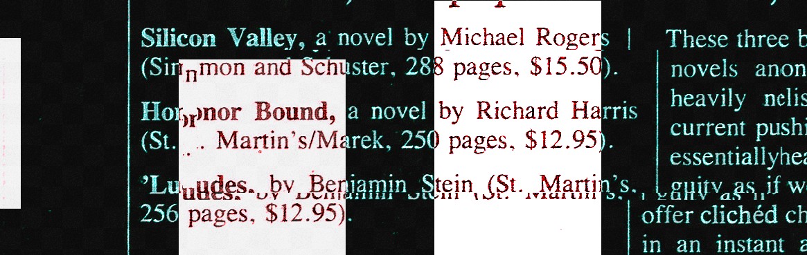 These three books are cheap because the question of how a writer will shape his material, of how an obsession with a subject will shape a writer, is never at issue. I was caught up by ‘Ludes, but it won’t stay with me; I felt merely used by Silicon Valley and Honor Bound. “The rich text resists its author as well as its readers,” it has been said; the texts here exist only to be manipulated by their authors and to manipulate their readers.