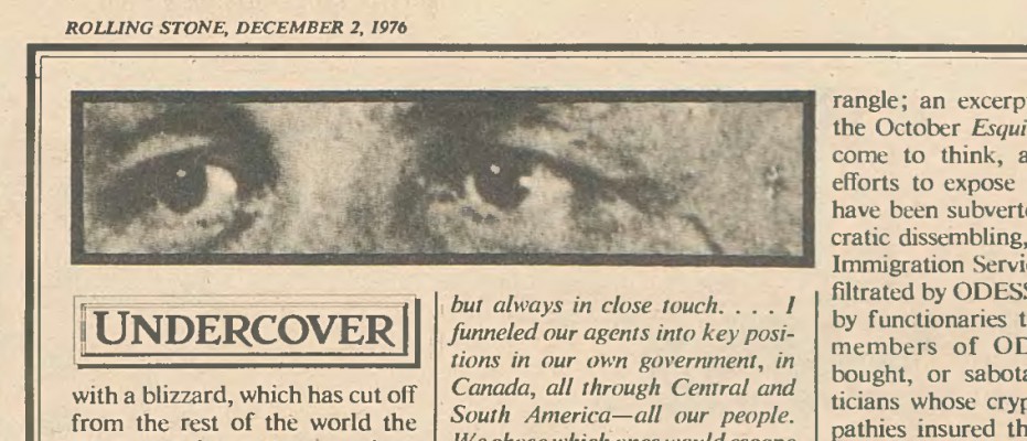 Such a situation parallels—with an insane inflation of realities—the beliefs of some private Nazi-hunters described in Howard Blum’s forthcoming nonfiction book, Wanted! The Search for Nazis in America (Quadrange; an excerpt appeared in the October Esquire), who have come to think, after years of efforts to expose war criminals have been subverted by bureaucratic dissembling, that the U.S. Immigration Service is either infiltrated by ODESSA, controlled by functionaries that American members of ODESSA have bought, or sabotaged by politicians whose crypto-Nazi sympathies insured they would not even have to be bought, but only pointed in the right direction. But just as I have tried to avoid setting forth the plot of The Wind Chill Factor—which, though it derives from Keeper of the Flame, an all-too-believable 1943 Spencer Tracy-Katherine Hepburn movie about a secret American fascist that cannot be summarized without appearing ridiculous—the impact of the book, and its relevance to the subject I have been chasing for the last three issues, cannot really be conveyed by reference to this fact or that. I don’t believe that because Nazi war criminals live in safety or hold political power the Reich will rise again, and I doubt Gifford does either. But I do believe that nothing is more difficult—if it is possible at all—than to reestablish limits that have been shattered.