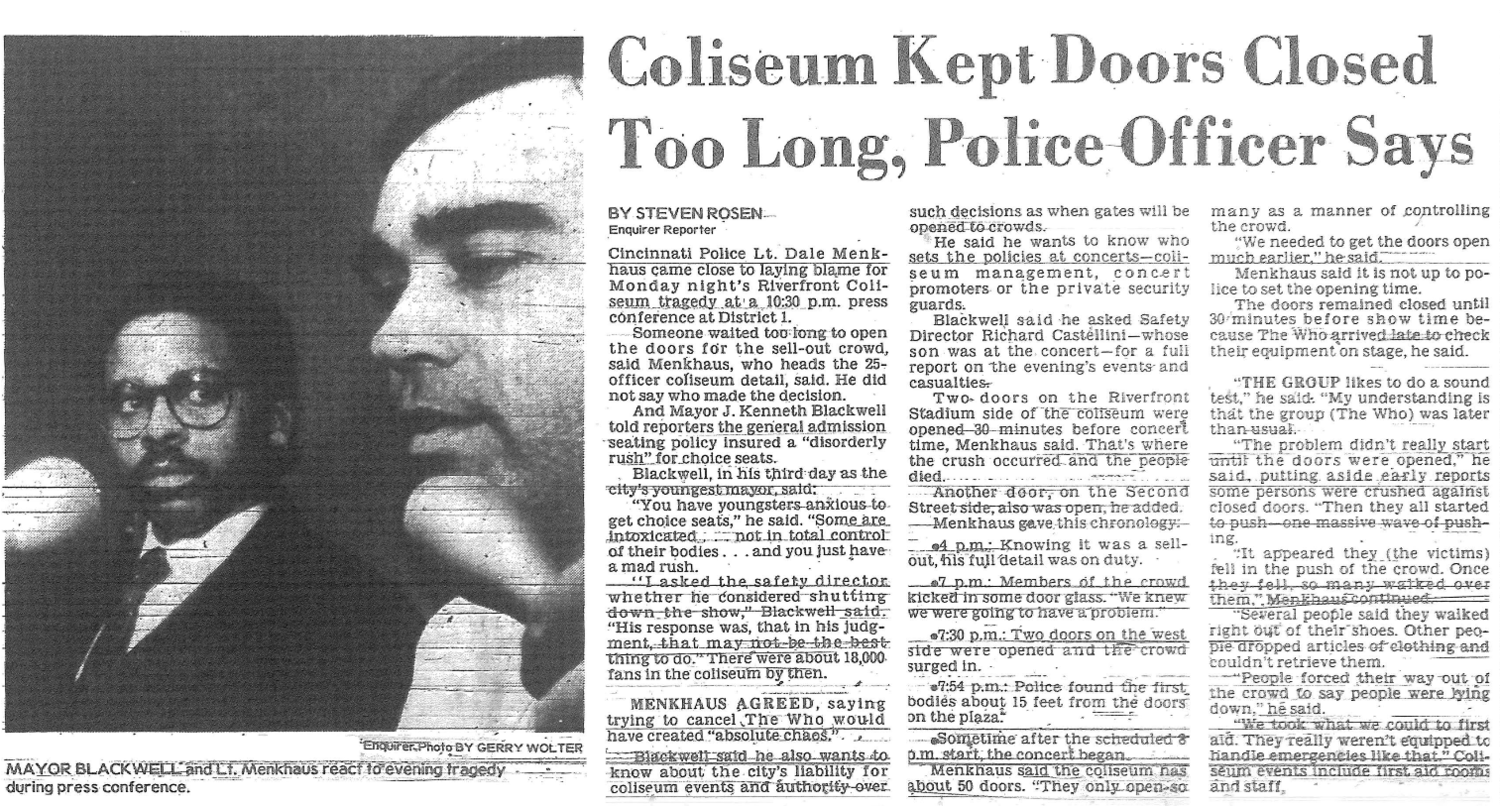 That event made headlines all over the world, most often as a condemnation of rock & roll (as on CBS news), or simply of America. Sixteen years as a unique and seminal rock & roll band aside, what happened in Cincinnati has probably made the Who more famous than they have ever been. Millions who had never heard of Keith Moon now think they know who the Who are.