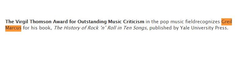 https://www.youtube.com/watch?v=gnVg0qtp57ENov 17, 2015: Greil Marcus delivers a brief acceptance speech at the ASCAP Foundation Deems Taylor-Virgil Thomson Awards for the Virgil Thomson Award for Outstanding Music Criticism for The History of Rock ‘n’ Roll in Ten Songs. (See the list of all winners.)thomson