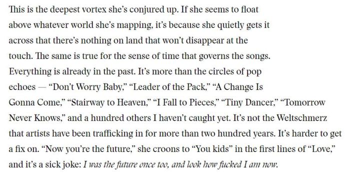 1. This column sent me to you-Tube for Lust for Life by Lana Del Ray.The nexus seemed more like a miasma of overproduced