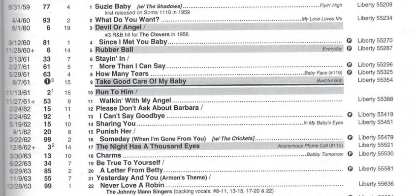 After Bobby made it into the top ten, things changed fast. Material from the Brill Building began to pour in. Vee liked “Rubber Ball,” for one. It also made #6, in early ’61. “Stayin’ In,” which peaked at #33, was next, and then “How Many Tears,” notable as the first Goffin-King number Vee recorded.