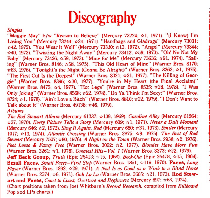 That title tune—it’s a goof, the rhymes range from the off­hand to the ridiculous, but it’s also as elemental as “Whole Lotta Shakin’,” as inspiring as “Like a Rolling Stone,” as mov­ing as “Try a Little Tenderness.” There’s a moment, after Rod has called off the band and just before it moves back for the final lines, when you can hear a soft, spontaneous “Hey…” out of one speaker; it’s as if one of the musicians was so caught up in the story Rod was telling he couldn’t help but wish the singer and his lover well. I know no friendlier event, not on record, not in real life, and it may sum up everything Rod Stewart and his band had to say.From there the tale is not pleasant. Never a Dull Moment(1972) was a strong record, lifted high by “You Wear It Well” and “Twisting the Night Away,” but there was much missing: mainly that sense that life itself had been crammed onto a 12-inch piece of plastic. Smiler (1974), Stewart’s last LP with his original band, was just rock-star flimsy: accidental genius turned to formula. Stewart broke up the Faces, replaced his band with expensive American sessionmen, and, within a year, had left England for tax exile. In 1976 he was denounced by the rising punk rockers as the epitome of the corrupt star living off the gullibility of his audience, blowing his fans a kiss while his heart held only contempt. He provided no reason to make one think the punks were wrong.