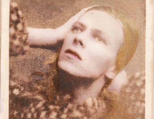 Even though David Bowie was not a star in the U.S. in 1971, RCA put nothing but his face on the cover of Hunky Dory. No name, no title, simply a hand-tinted, sepia-toned photo of a man with blue eyes holding his long blond hair back from his forehead, a face that was suspended somewhere between the Pre-Raphaelites and Bloomsbury but that, as the person looked up and out of the frame, gazed, too, into an unwritten future, a future that the songs on the album you held in your hands were trying to write. Whatever else this person is, he is beautiful. He looks as if he’ll live forever.