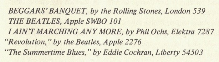 Also re: “Revolution,” cf. Christgau, who in ’69 called it “artistically indefensible,” because of its “softheartedness” (he didn’t mention the guitars). From a July 1969 essay that covers similar terrain, asks similar questions.