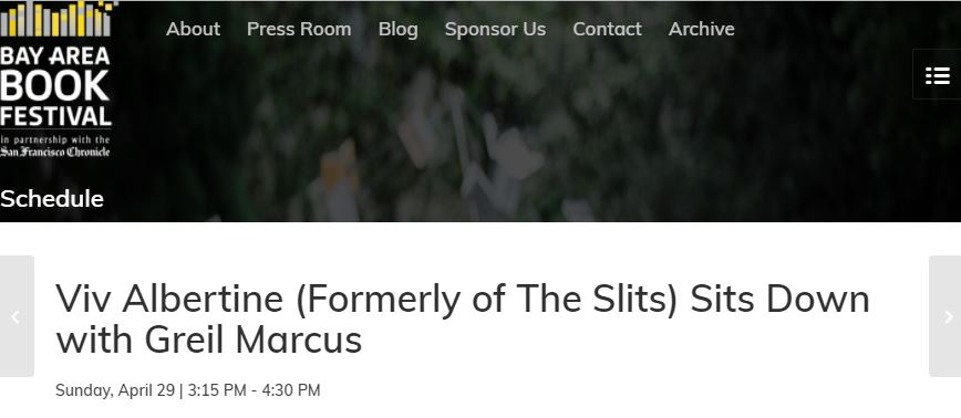 April 26, 2018 by sw Announcement: Viv Albertine Sits Down with Greil Marcus Greil Marcus and Viv Albertine, live and in conversation (details of which can be found here.) Share this: Click to share on X (Opens in new window) X Click to share on Facebook (Opens in new window) Facebook Click to share on Tumblr (Opens in new window) Tumblr Like Loading...
