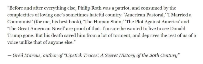 From a roundup of reactions to Philip Roth’s death at the San Francisco Chronicle. See more Greil Marcus writings on Philip Roth here.