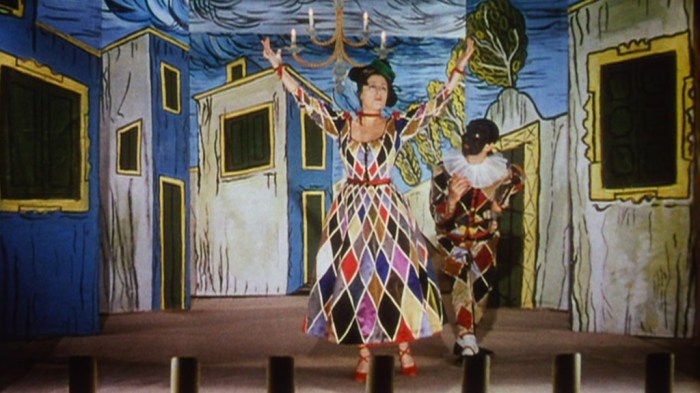 Writing in 1961, Kael describes catching a real-life version of Jess’s collage—and Modess’s famous slogan—when she found herself in a theater “looking at a frightfully expensive, elaborately staged movie. The beautiful heroine, in pale blue, was descending an elegant beige staircase, when a voice from the dark piped up—‘Modess, because…'” It had to be Jess, sitting right next to Kael, seeing his own collage coming back to him on the screen.