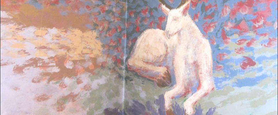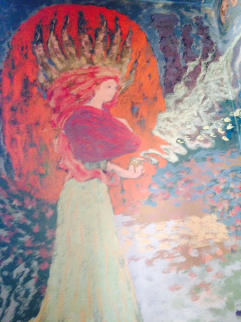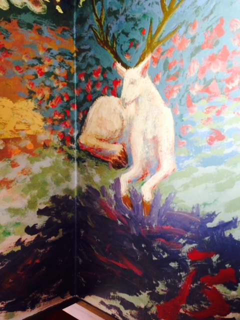 Jess climbed the stairs to the bedroom floor and all but opened a new storey. Suddenly, you were in a pagan forest. The lines between humans, gods, and goddesses were erased. No sense of time held. Nothing held still. Every door, molding, ceiling runner, and wall spoke in its own voice, or whispered, or stood silent, knowing its language had long ago left the tongue for the collective unconscious. On both sides of the stairwell, a mural, or a story, began in an explosion that opened into a landscape shaped equally by Bosch, the Grimms, and Dante Gabriel Rossetti. It stretched the entire length of the walls on one side of the upstairs hallway, then curved around a corner into a dead end, though it looked as if it could not bear to stop. But first, as you climbed the stairs, you saw the spell in the act of being cast.