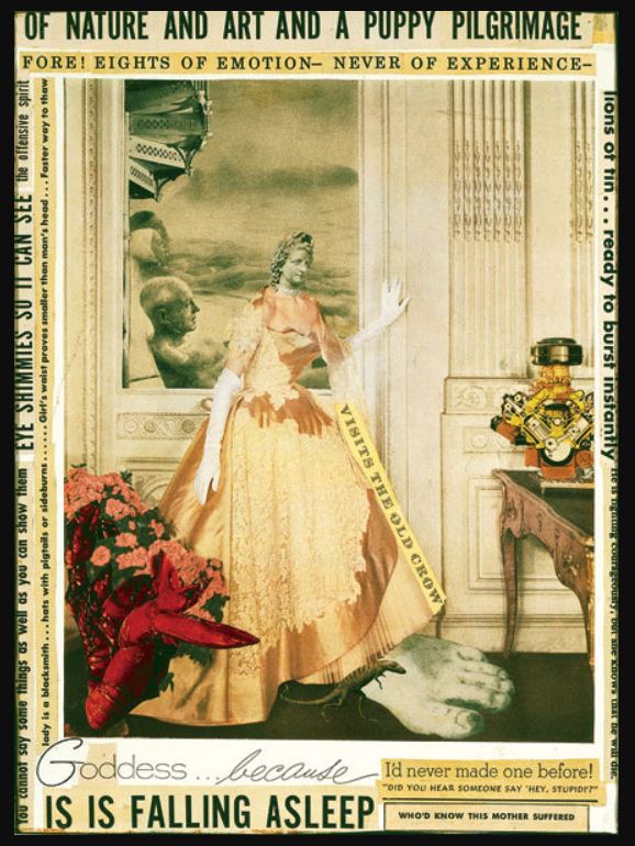Jess made what he called “Translations,” “Salvages,” or “Paste-Ups”: paintings based on photographs or over paintings of other paintings, often with such heavy applications of paint that the images stuck out of the frames like impasto elves, and the kind of collages Raoul Hausmann or Hannah Hoch might have made if they’d lived in San Francisco in the ’50s. They were fabulously intricate recombinations of magazine ads, slogans, and screaming orphaned phrases, as in Goddess Because Is is Falling Asleep, 1954. At the time, Modess sanitary napkins were advertised as discreet, comfortable, and luxurious, with deluxe tableaux of overdressed women in the throes of what was then known as gracious living: Jess’s version merely pushed the visual idea a step or two further, where it blew up in its own face.