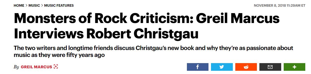 November 8, 2018 by GM Admin Greil Marcus Interviews Robert Christgau (11/8/18) In Rolling Stone, G.M. interviews Robert Christgau, on the occasion of the release of RC’s new book, Is It Still Good To Ya? Fifty Years of Rock Criticism 1967-2017. Share this: Click to share on X (Opens in new window) X Click to share on Facebook (Opens in new window) Facebook Click to share on Tumblr (Opens in new window) Tumblr Like Loading...