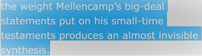 The old man is talking in “Minutes to Memories.” The tune begins quietly enough, intensifies without tipping its hand, but at the end Mellencamp is pure fury: it’s probably the best singing of his life, but his rage doesn’t seem to make sense, and it only makes sense when you understand that Mellencamp’s account of a conversation on a train is a realized version of his “The Face of the Nation.” The singer has learned something from the old man, he wants to get across what it was, and he’s terrified he won’t be ab]e to do it. The drama of the performance, its violence, at first smothers lines and then, because it’s impossible for you not to taste that fury again and again, reveals them: “He said an honest man’s pillow is his peace of mind.” One good line brings out others, all across the album.