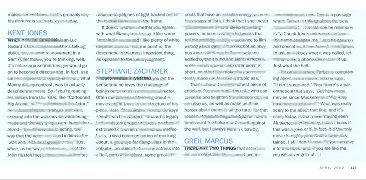 One of the things that I found scariest were the pieces in which Farber went through the work of a particular person, like Howard Hawks, in three or four pages. Just like that—boom, boom, boom, in and out. Like somebody walking through a room and looking around, going in one door and out the other.