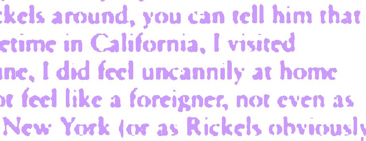 If you see Rickels around, you can tell him that when, after a lifetime in California, I visited Germany last June, I did feel uncannily at home there and did not feel like a foreigner, not even as much as I do in New York (or as Rickels obviously and delightedly does in California). But the reasons for that lack of foreignness, I’d guess, are almost entirely personal and particular. Rickels can put that in his thesis—which seems to hold that in a construct like California there are no individuals, no personal and no particular—and smoke it.