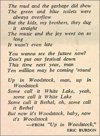 Three hundred thousand people taking whatever went down all around them and a new challenge to their guts and their ingenuity, sitting on a great hill all through the night to hear their favorites play and play and play, working for them, making new discoveries about each other and the land day after day, digging it, now Janis! Sly Stone! The Airplane! The Dead! The Who! The Band! Hendrix—this is just the beginning—or the end—and we must now sit down and figure out how to make it work.