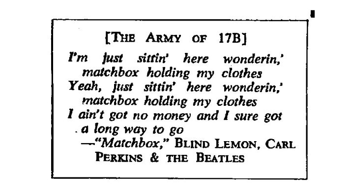 It was an amazing sight, the highway to White Lake: it looked, as someone said, like Napoleon’s army retreating from Moscow. It looked like that for three days. Everywhere one saw tents and campfires, cars rolled into ditches, people walking, lying down, drinking, eating, reading, singing. Kids were sleeping, making love, wading in the marshes, trying to milk the local cows and trying to cook the local corn. The army of New York State Quick-way 17B was on maneuvers.