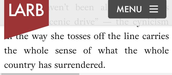 August 23, 2019 by sw Real Life Rock Top 10, ‘Los Angeles Review of Books’ Debut (8/23/19) Janet Weiss, Peggy Sue, Betsy Devos, Lana Del Rey, Quentin Tarantino and others usher in the debut of Real Life Rock Top 10 at Los Angeles Review of Books. Share this: Click to share on X (Opens in new window) X Click to share on Facebook (Opens in new window) Facebook Click to share on Tumblr (Opens in new window) Tumblr Like Loading...