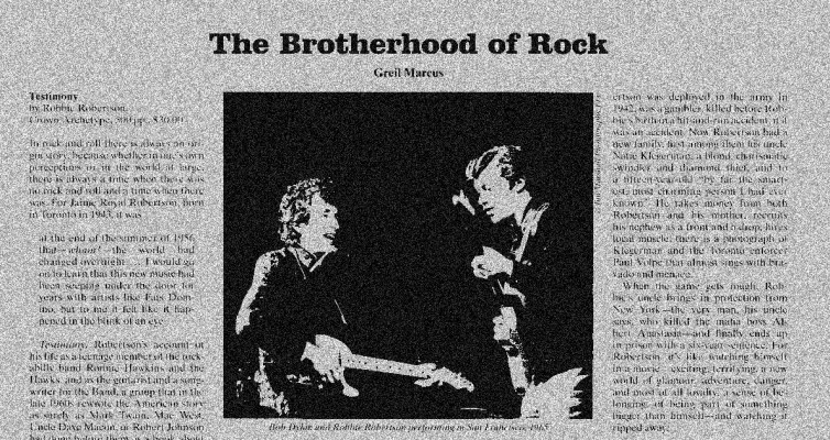 Testimony, Robertson’s account of his life as a teenage member of the rockabilly band Ronnie Hawkins and the Hawks, and as the guitarist and a songwriter for the Band, a group that in the late 1960s rewrote the American story as surely as Mark Twain, Mae West, Uncle Dave Macon, or Robert Johnson had done before them, is a book about the revelation of such moments. It presents itself as a conventional memoir of family and professional life, from Robertson’s boyhood to Thanksgiving night 1976, when the five founding members of the Band played their last show, which they called “The Last Waltz.” They were the drummer Levon Helm (who, like Ronnie Hawkins, was from Arkansas), the pianist Richard Manuel, the bassist Rick Danko, the organist Garth Hudson (each, like Robertson, from Ontario), and Robertson, all of whom, from 1960 to 1963, joined Helm in Hawkins’s band. But in fact it is a book of shocks.