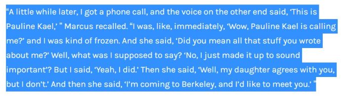 So did they meet? What happened? My fave anecdote about Kael is the one about how you always knew where she stood on a film, often before she ever got out of the movie theater. Bigger than life; J.J. Hunsecker in Sweet Smell of Success. The overwriting dis in Greil’s original review seems characteristic of a lot of NY-er writing over the years.