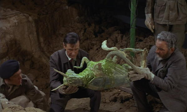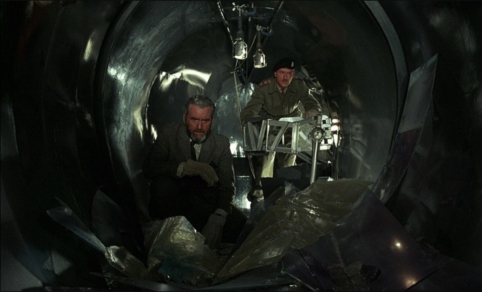 The time and place is Swinging London, where the reconstruction of a subway station has revealed a large, oblong, metal object: a spaceship, as any moviegoer could tell the cops and bureaucrats who can’t. Near the object are the fossilized remains of apemen; within it are the perfectly preserved corpses of human-sized insects. The scientist Quatermass is called in.