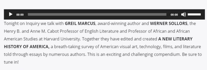July 1, 2020 by sw On ‘Inquiry’ (WCIN) with Werner Sollors (6/29/20) Share this: Click to share on X (Opens in new window) X Click to share on Facebook (Opens in new window) Facebook Click to share on Tumblr (Opens in new window) Tumblr Like Loading...