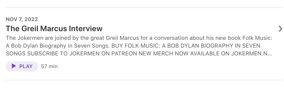 November 11, 2022 by sw GM on Jokermen podcast (11/7/22) Great discussion on Folk Music with Greil Marcus and the hosts of the Jokermen podcast. On Apple podcasts, can also be heard on Spotify. Share this: Share on X (Opens in new window) X Share on Facebook (Opens in new window) Facebook Share on Tumblr (Opens in new window) Tumblr Like Loading...