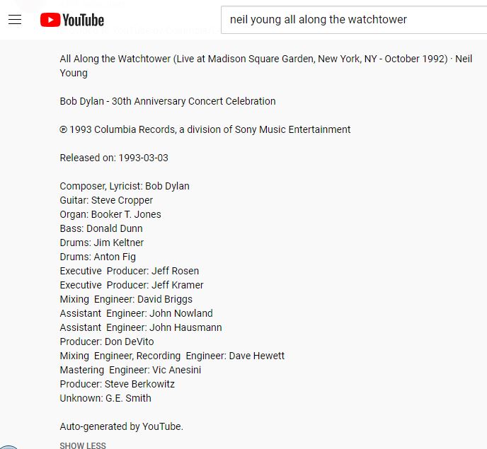 (p.s. For your files: I recently noticed that in the YouTube description accompanying the official audio of Neil Young’s version of “All Along The Watchtower” from the Bob Dylan anniversary thing [see screenshot], your man G.E. Smith is credited with “Unknown.” I have a feeling you would not disagree.)